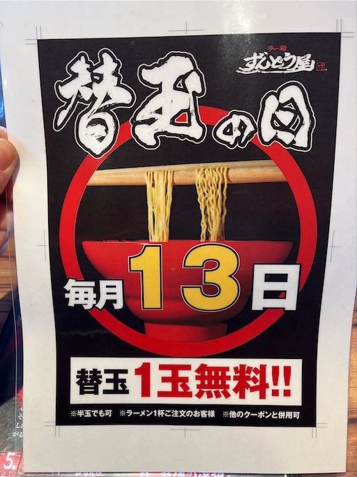 ちなみに画像の通り、ずんどう屋では毎月13日に替え玉無料をやってます。