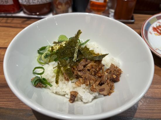 チャーシューをほぐしたお肉、そして青ネギと白ネギがご飯に乗ってます。